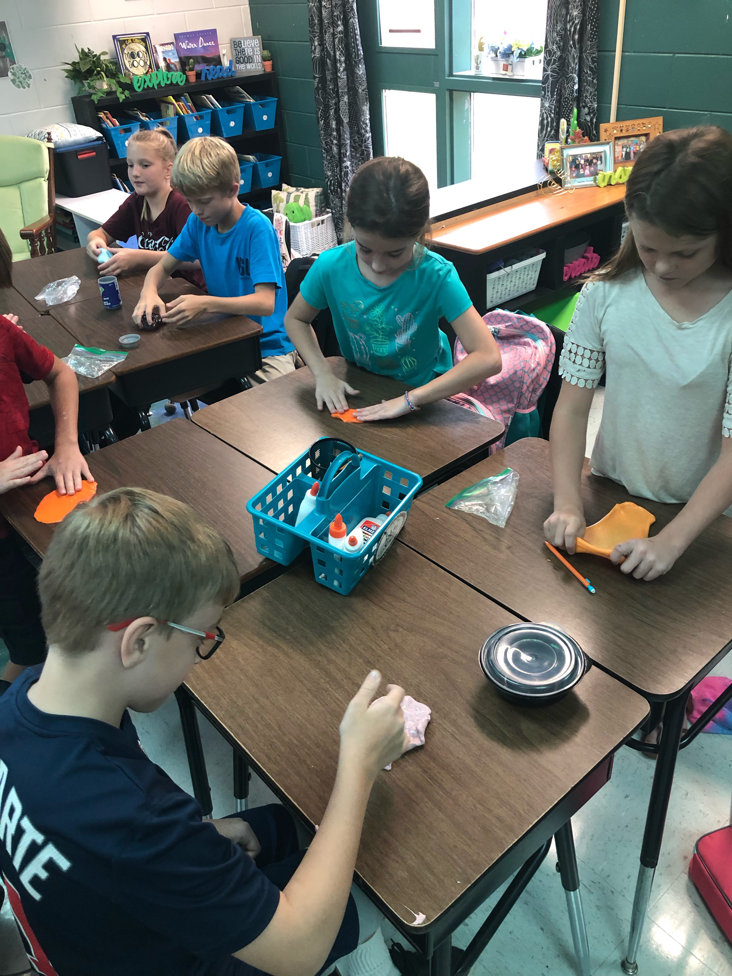 Mrs. Dukes’ 4th grade science classes have been busy working on the phases of water and the water cycle. While covering evaporation, the students collected various types of slime. Each class stretched and flatten out the slime, pressed the pieces together, and left it out to dry. Over the course of several days, they were able to watch the process of evaporation. The students learned that we cannot see the moisture evaporating, but that the color and other contents of the slime remain as a piece of art to emphasize the importance of the water cycle.