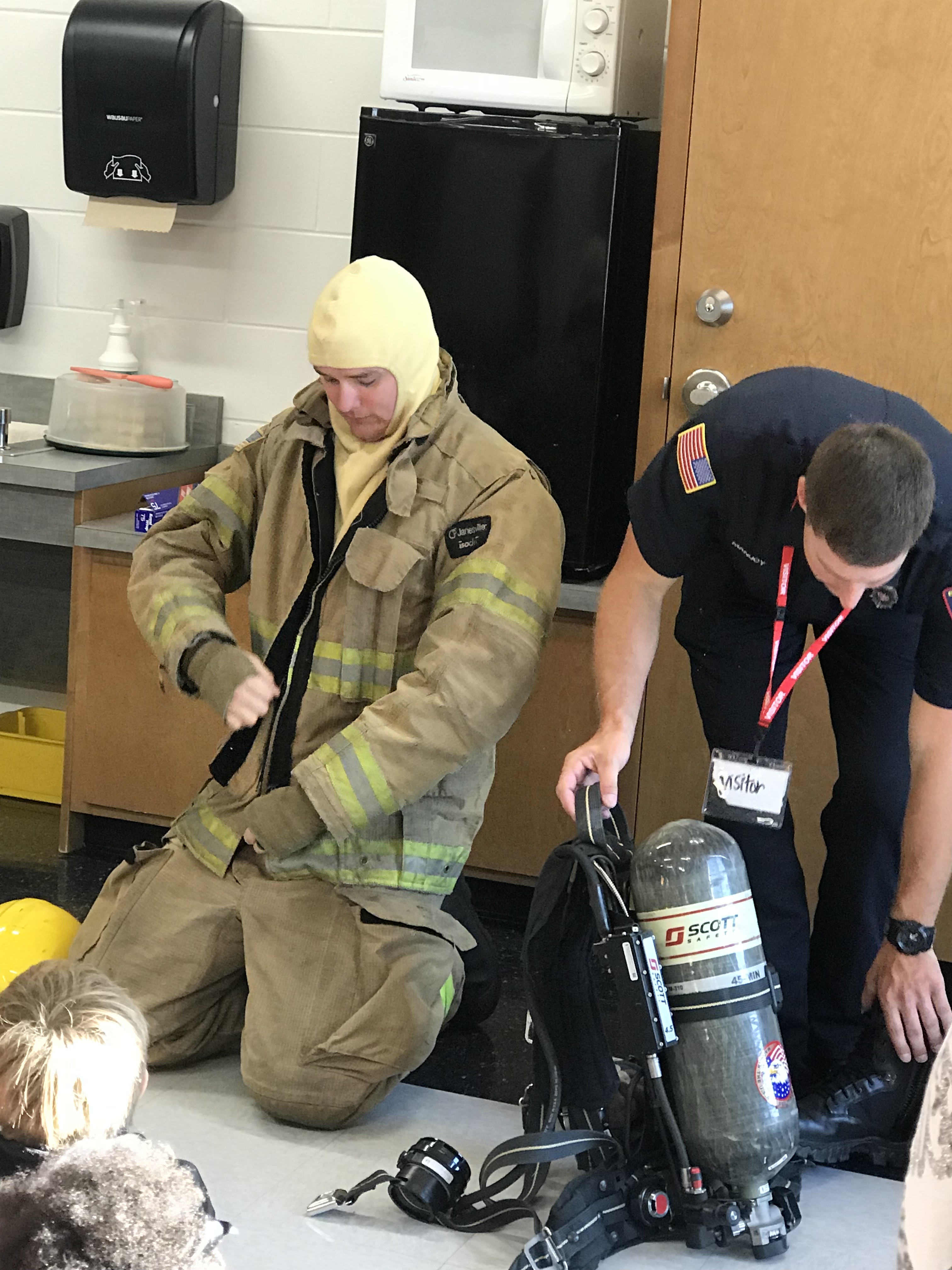 First graders enjoyed the Friendly Firefighter program this morning! Students learned what to do in case of a fire emergency. They also watched Firefighter White dress in his turn-out gear and explained that they should never be scared of him. Students enjoyed interacting and learning the steps of what to do in an emergency! Thanks Firefighter White and Engineer Manucy!