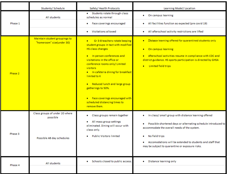 Moving to Level 3 and 4 will be determined by the above percentages which are calculated by the total number of current Covid positive added to the number of quarantined students (.5 value) divided by the total number of in-person instruction students. If we exceed the 4% value with Covid influenced absence, we will move to phase 3. If the number of Covid influenced absences reaches the 8% value, we will advance to phase 4. Faculty absenteeism due to Covid among faculty and staff will be an overriding factor regardless of the percentages of student cases.